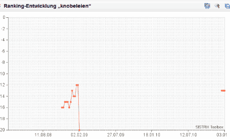 Vor gut zwei Jahren, da wurde diese Webseite für die Google-Suche nach dem Begriff Knobeleien auf der zweiten Ergebnisseite gelistet. Es ging langsam aufwärts mit den Rankings bis hin zur Position 12 in den Google Serps, doch dann war schlagartig Feierabend. Es folgte der Absturz in die Bedeutungslosigkeit. Anbei der Verlauf, protokolliert von den tollen Sistrix Tools.